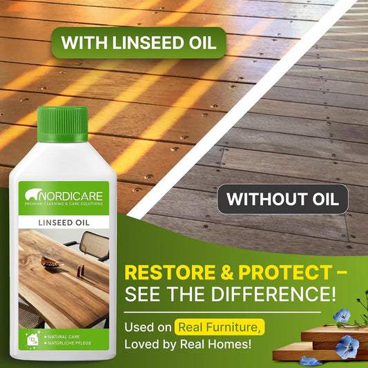 Nordicare Linseed Oil for Wood - Pure & Natural Linseed Oil for The Entire Indoor Area - Food-Safe Linseed Oil for Wood Furniture - Underlines The Original Wood Structure - Made in Denmark (500ml)